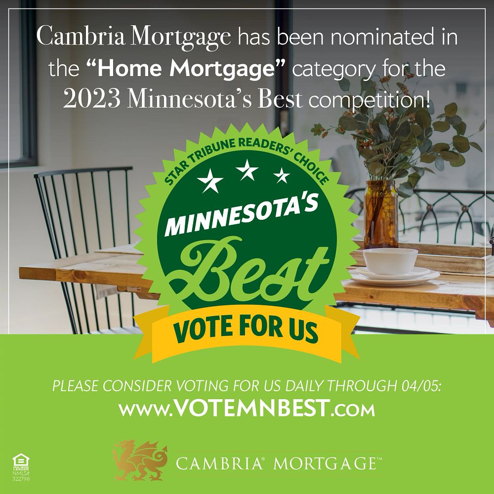 It’s an honor and a privilege to have been nominated in the “Home Mortgage” category for the 2023 Minnesota’s Best competition. In order to win, we need your help! Would you consider voting for Cambria Mortgage? Voting is open daily through April 5, 2023 and takes just a few seconds!