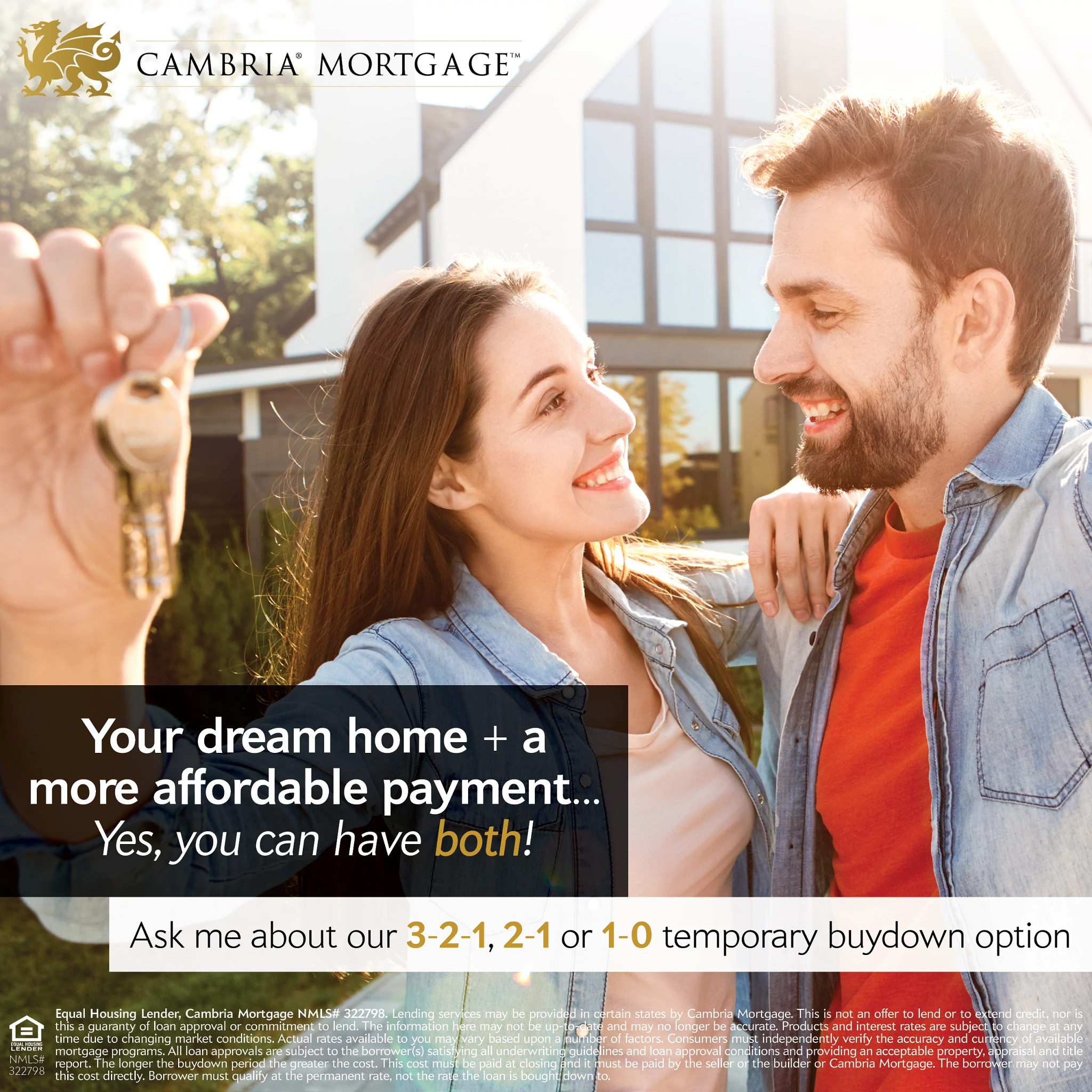Equal Housing Lender, Cambria Mortgage NMLS# 322798. Lending services may be provided in certain states by Cambria Mortgage. This is not an offer to lend or to extend credit, nor is this a guaranty of loan approval or commitment to lend. The information here may not be up-to-date and may no longer be accurate. Products and interest rates are subject to change at any time due to changing market conditions. Actual rates available to you may vary based upon a number of factors. Consumers must independently verify the accuracy and currency of available mortgage programs. All loan approvals are subject to the borrower(s) satisfying all underwriting guidelines and loan approval conditions and providing an acceptable property, appraisal and title report. The longer the buydown period the greater the cost. This cost must be paid at closing and it must be paid by the seller or the builder or Cambria Mortgage. The borrower may not pay this cost directly. Borrower must qualify at the permanent rate, not the rate the loan is bought down to.